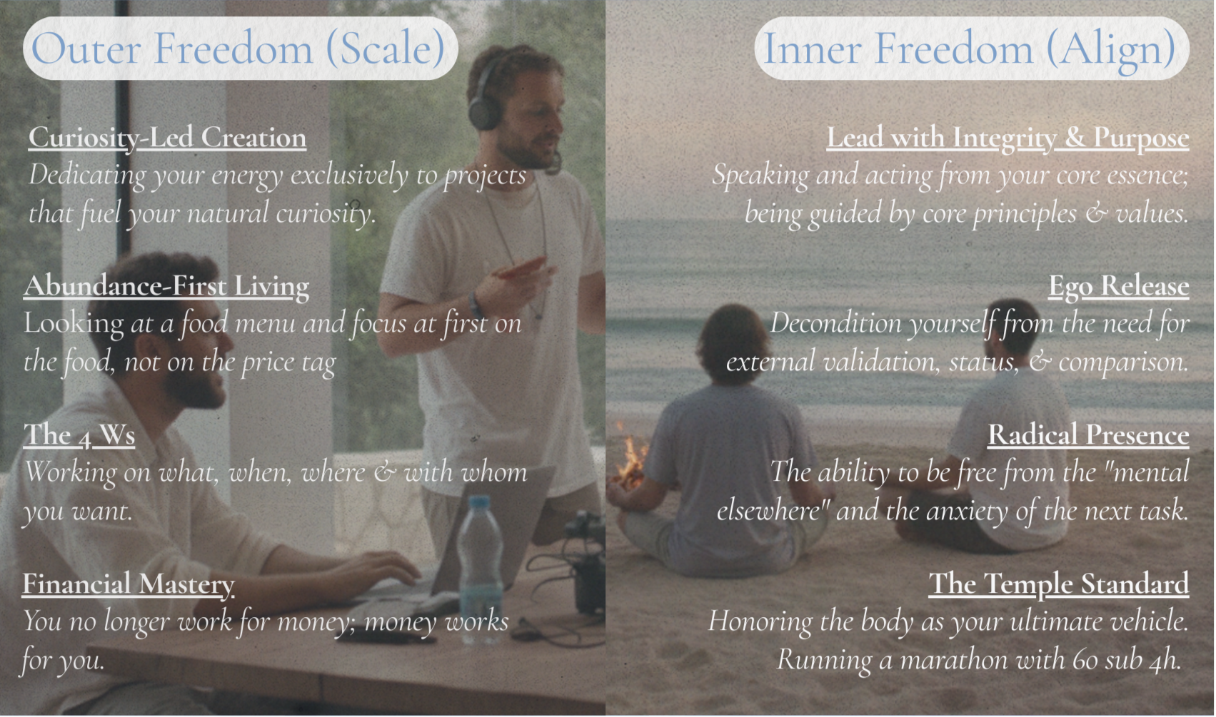 2. The Inner Freedom: To live led by intrinsic motivation, natural curiosity, and deep human connection.We scale our revenue while cultivating our inner selves—sharing deep talks around bonfires, deconstructing bottlenecks in masterminds, and exploring the world from our Founder Houses.